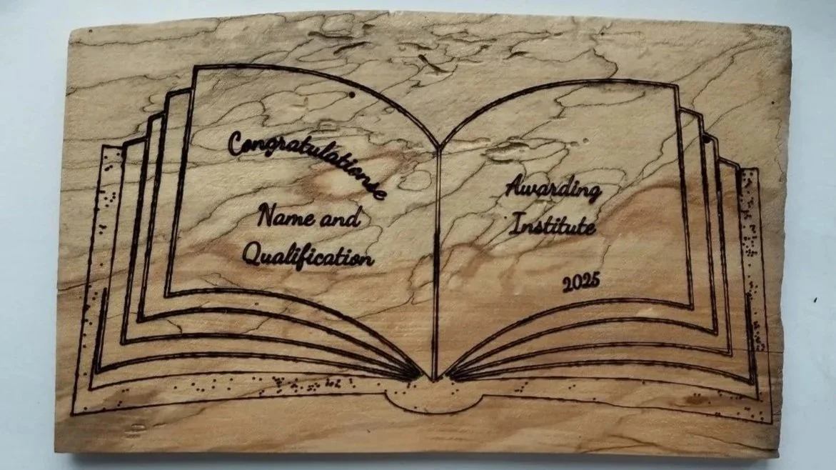 A gift to mark a student's graduation on spalted beech blank .Name, qualification and college logo have been removed for demo purposes.